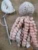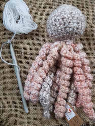 The hand crocheted octopus is made by Emma, our triple-threat crafter, who is equally at home with a sewing needle, knitting needle or crochet hook. Emma doesn’t do patterns, she just picks up a ball of wool, or a scrap of fabric and turns it into something beautiful. We think the octopus looks great as a decorative piece in the living room, or hung above a cot, or maybe just sitting sweetly on a bedside unit.