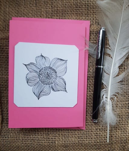 Claire destresses from her busy day job by crafting these highly structured monochrome cards. Apparently, drawing the fine lines improves concentration and is super relaxing. Teamed with a matching envelope, these cards could be used for used for Birthdays, Thank-yous, or those just thought I'd say hello type of occasion. Claire's drawings change with the seasons, and we are currently showcasing her Spring design.